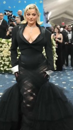 Pevačica se na Met Gali pojavila u crnoj jaknici i dugačkoj suknji od tila uparenoj sa mrežastim rukavicama. Iza njenog izgleda stoji poznati dizajner Kristijan Siriano.
