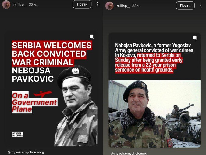 Ona je na svom Instagram nalogu prenela objavu sa fotografijama generala Pavkovića pored kojih stoji opis: