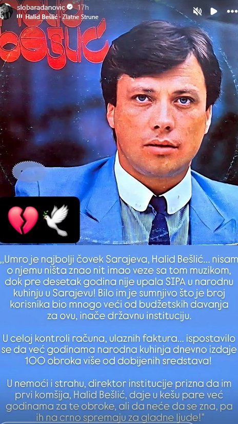 - Umro je najbolji čovek Sarajeva, Halid Bešlić... nisam o njemu ništa znao nit imao veze sa tom muzikom, dok pre desetak godina nije upala SIPA u narodnu kuhinju u Sarajevu! Bilo im je sumnjivo što je broj korisnika bio mnogo veći od budžetskih davanja za ovu, inače državnu instituciju - stoji u objavi.
