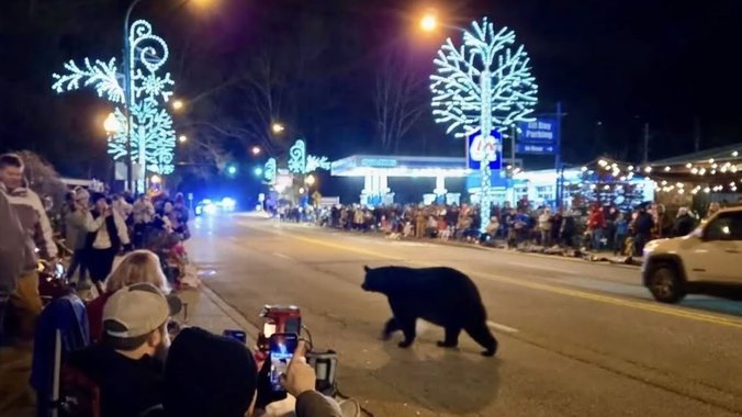 Amanda Snuk-Pejdž uspela je da fotografiše trenutak kada je medved zakoračio na rutu tradicionalne božićne parade Fantasy of Lights u Gatlinburgu, koja se ove godine održava 50. put.