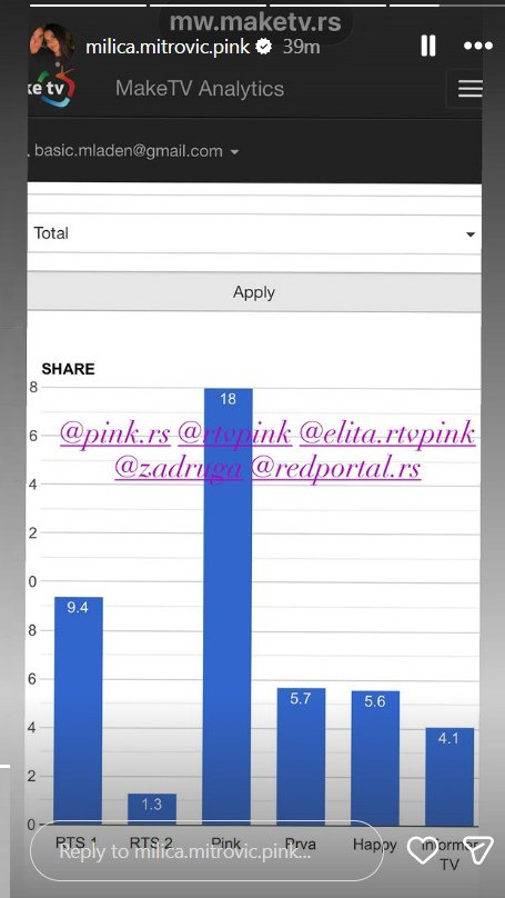 Sa udelom gledanosti od 18%, Pink potvrđuje svoje lidersko mesto po ovom parametru.