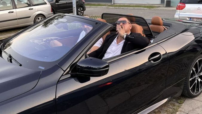 Taki je stigao u skupocenoj mašini marke bmw, a kad je parkirao auto zapalio je tompus i pozirao za portal Pink.rs.