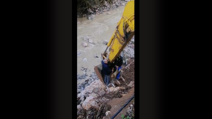 Dvojica radnika su se spustila do reke, pa su je popeli na viljušku bagera, koja ih je digla na put. ☝