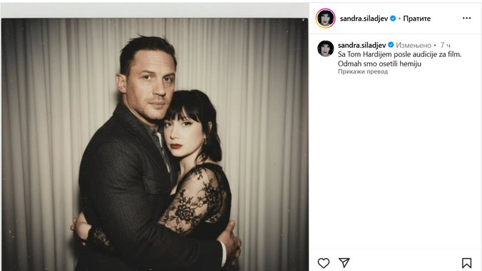 Glumica Sandra SIlađev je na svom Instragram nalogu iznenadila sve kada je podelila sliku sa irksim glumcem Tomom Haridijem.