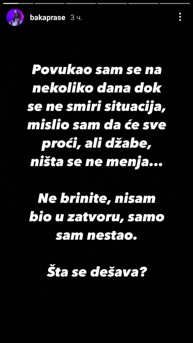- Povukao sam se na nekoliko dana dok se ne smiri situacija, milsio sam da će sve proći, ali džabe, ništa se ne menja... Ne brinite, nisam bio u zatvoru, samo sam nestao. Šta se dešava - započeo je Baka Prase i nastavio:
