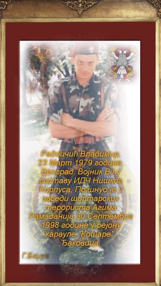 Na društvenim mrežama se šire slike nje sa slikom njenog sina koji je poginuo 30. septembra u zasedi teroriste Agima Ramadanija u regionu karaule Košare kod Đakovice. Vladimir Radoičić je rođen 23. marta 1979. godine i imao je nepunih 20 godina kada je poginuo.