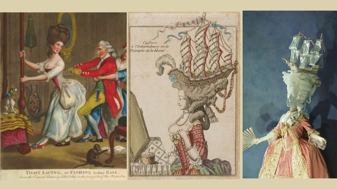 Marija Antoaneta je posebno bila karikirana zbog svog raskošnog modnog stila, višeslojnih haljina od skupocenih materijala i puf-frizure odnosno umetka za kosu između perike i šešira sa tematskim dodacima od cveća, perja, traka, gaze ili neke druge rekvizite koja je bila odraz ličnih, popularno-kulturnih ili političkih dešavanja.