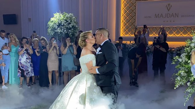 Biljana je sa svojim izabranikom u raskočnoj venčanici prva pristigla na gala proslavu, a odmah nakon mladenaca počeli su da pristižu članovi porodice, prijatelji i kolege sa estrade.