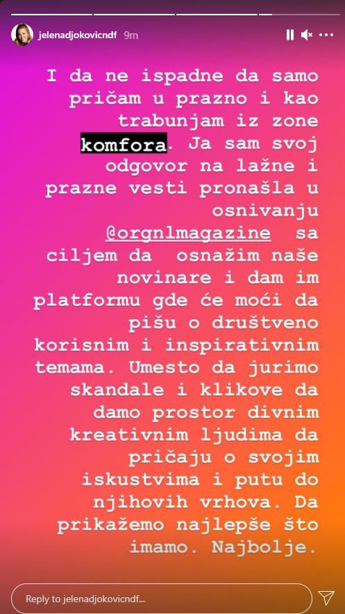 Jelenine storije koje je objavila na Instagram profilu prenosimo u celosti: