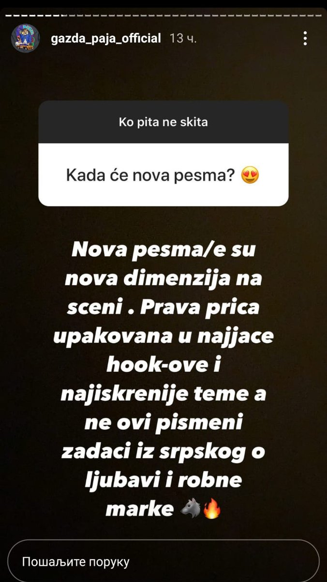 Na pitanje o novoj pesmi odgovorio je široko. Svakako da sprema nešto novo, ali to neće biti samo još jedna nova pesma, već sasvim nova priča i stil.