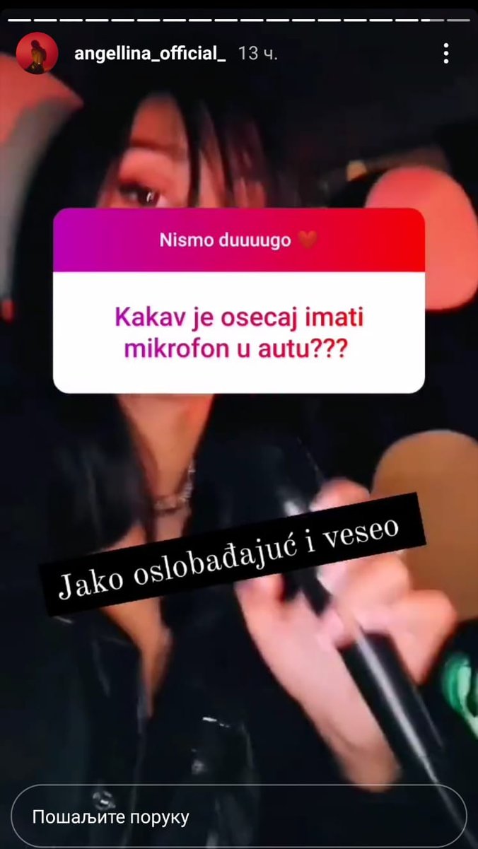 Mikrofon je ponela i sa sobom u auto kako joj nijednog trenutka ne bi bilo dosadno. Svi znamo kako ponekad mogu da budu dugaÄke i optereÄujuÄe saobraÄajne gužve u Beogradu, ali AnÄelina je naÅ”la svoj spas u pevanju. Ovako Äe joj brže proÄi vreme i biÄe manje nervozna i džangrizava, Å”to je sluÄaj sa dosta vozaÄa. Zapela je pesmu Post Malonea - Better now. Kaže da imati mikrofon u automobilu stvara jako oslobaÄajuÄi oseÄaj i atmosferu.