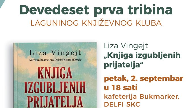 Nova tribina Laguninog književnog kluba, 91. po redu, održaće se u petak, 2. septembra, u Delfi knjižari SKC u 18 sati, a tema razgovora je roman američke autorke Lize Vingejt Knjiga izgubljenih prijatelja 📗📜.