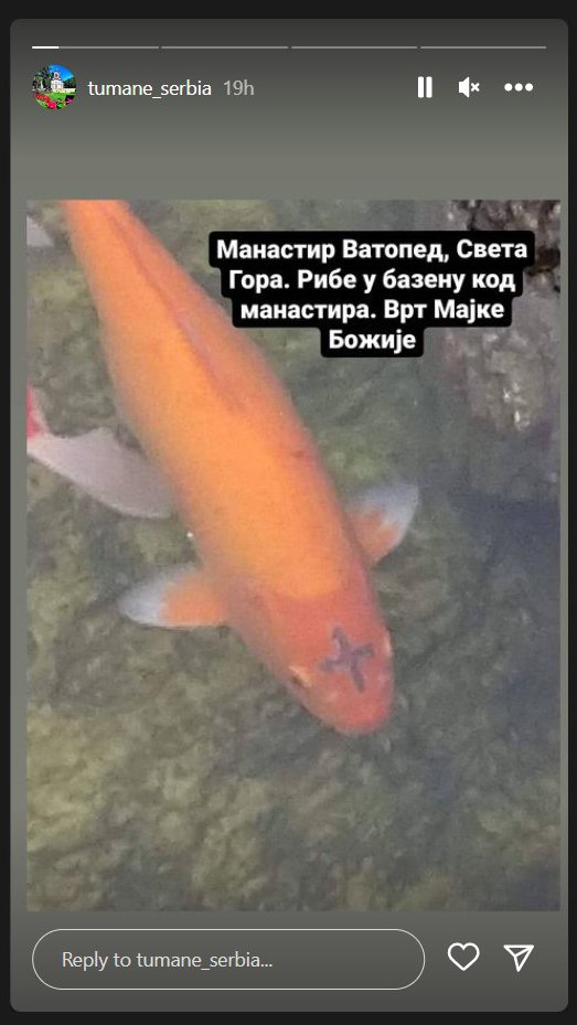 Na Svetoj Gori u blizini manastora Vatoped nalazi se ribnjak čije ribe Božijim čudom imaju krst na glavi. Ovu divnu pojava objavljena je nalogu tumane_serbia na Instagramu i kratko je napisano.