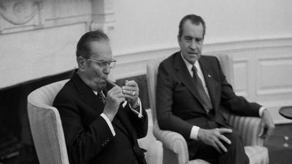 Prilikom prijema u Ovalnom kabinetu Bele kuće, radnom prostoru predsednika Sjedinjenih Država, Tito je zapalio tompus, a fotografije i snimci sa ovog susreta godinama su predmet rasprava na društvenim mrežama. Navodno je Nikson diskretno sugerisao jugoslovenskom predsedniku: