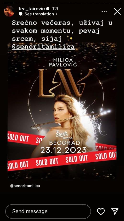 Milica je pokazala da ima i ogromnu podršku kolega. Pored gostiju, Cobija, Saše Matića, Jelene Karleuše i Nemanje Vojvodića, koji je zamenio Acu Lukasa sa kojim Milica ima duet ali nisu u dobrim odnosima, pevačicu su podržale i kolege pa smo u publici mogli videti i Suzanu Jovanović, Ćema, Anu Sević, Tijanu Dapčević, Minu Milutinović, Leontinu i druge. Tea Tairović na Instagram storiju poželela Milicu sreću, dok je Aleksandra Prijović poslala cveće.💐