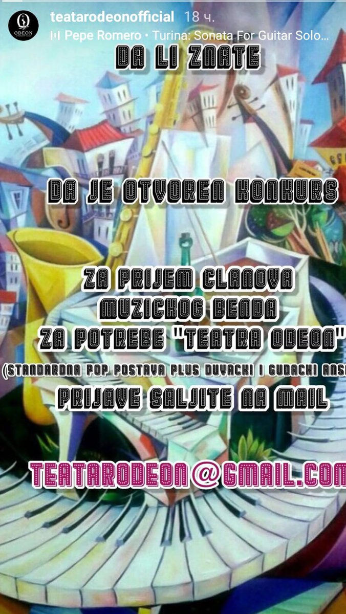 Da li znate da je otvoren konkurs za prijem članova muzičkog benda za potrebe Teatra Odeon? 🤔