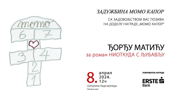 Nagrada Momo Kapor će Đorđu Matiću biti uručena na svečanosti u ponedeljak, 8. aprila, sa početkom u 12 časova u Svečanoj sali Skupštine grada. Nagrada se sastoji od plakete od srebra sa motivom školice i novčanog iznosa koji dodeljuje Erste Banka, višegodišnji pokrovitelj književne i likovne nagrade Momo Kapor, osvedočeni prijatelj kulture, umetnosti i savremenog kulturnog stvaralaštva na našim prostorima. Pružajući podršku kvalitetnim kulturnim i umetničkim sadržajima, Erste Banka istovremeno podržava očuvanje naše tradicije i kulturnog nasleđa i njegovih umetničkih vrednosti, kako bi stvorila jaku osnovu za kreiranje otvorene i dinamične kulturne stvarnosti i jedinstvenog kulturnog identiteta naše zemlje.