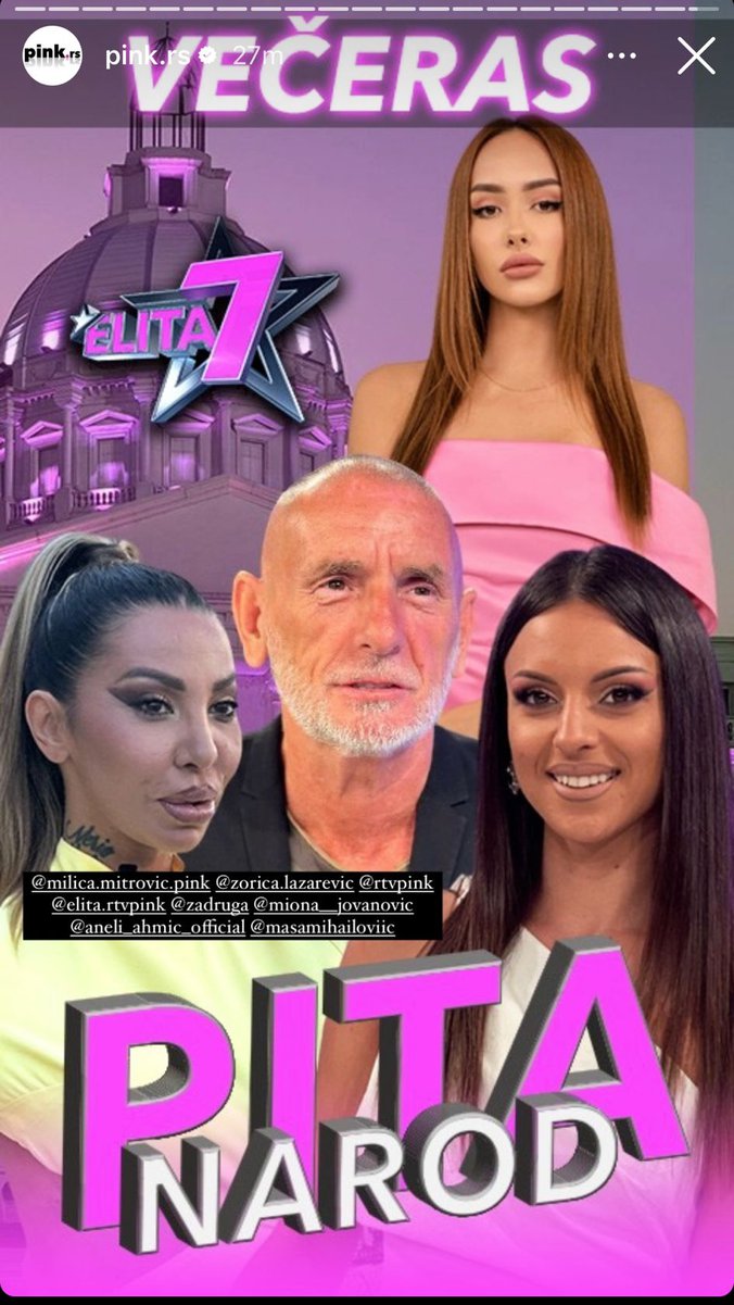 U večerašnjem izdanju emisije Narod pita na Pinku gledaoci će imati priliku da prate okršaj između sada već bivših učesnika Elite 7 Aneli Ahmić, Mione Jovanović i Lepog Miće! 📺