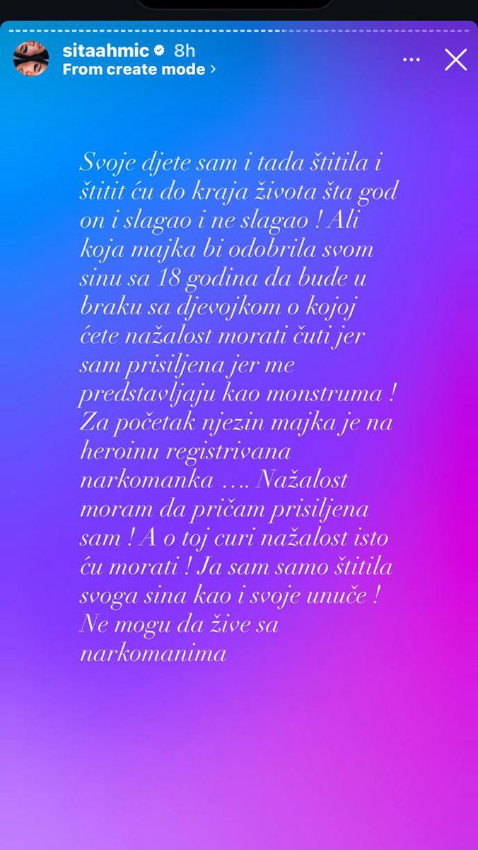 Odmah se na Instagramu oglasila Sita rečima da njen sin laže o nekim stvarima i da će se ona uvek boriti za njega. O njegovoj supruzi je rekla da je narkomanka i da će to pokazati u narednom periodu.